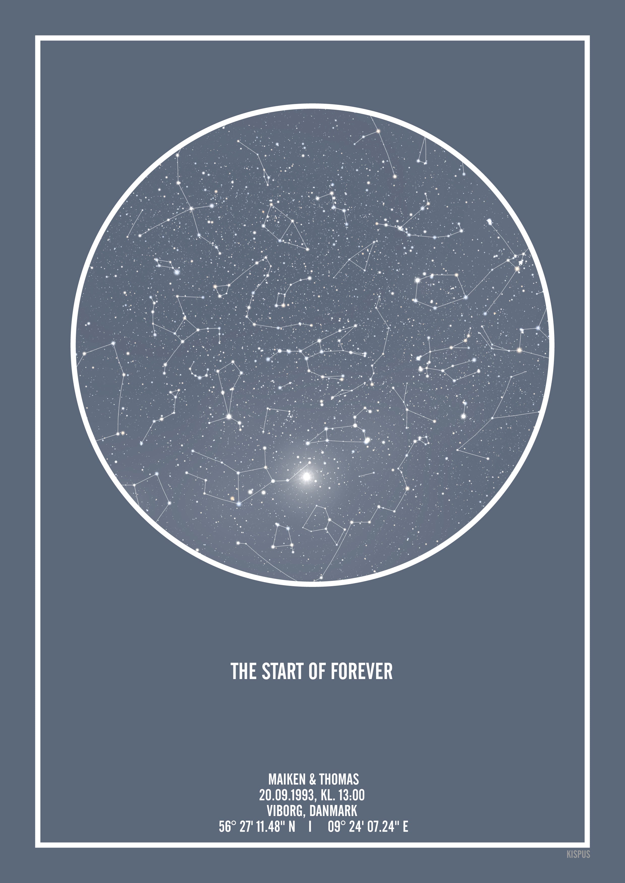 Produkt ID. Personlig-stjernehimmel-plakat-blgr-hvid-tekst-blågrå-himmel-stjernehimmel-med-stjernebilleder