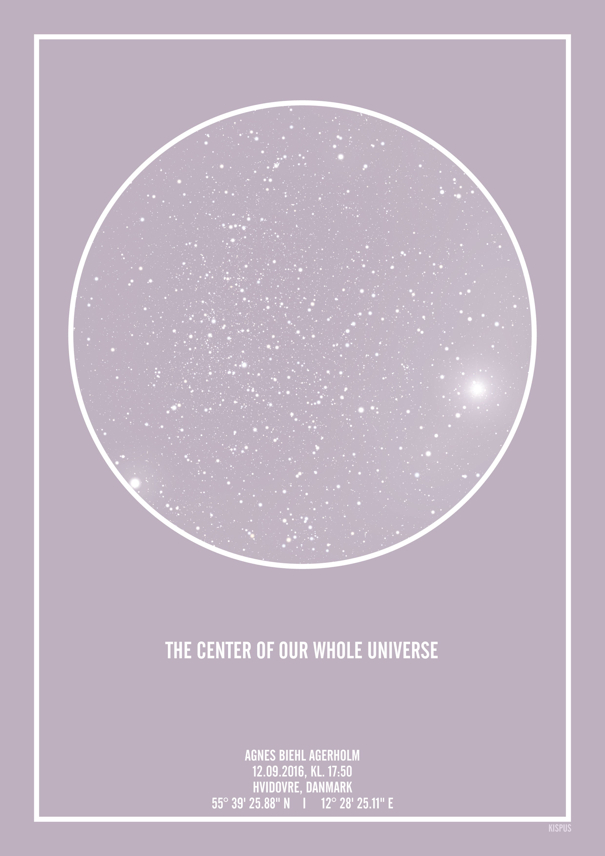 Produkt ID. Personlig-stjernehimmel-plakat-lyselilla-hvid-tekst-lyselilla-himmel-klar-himmel