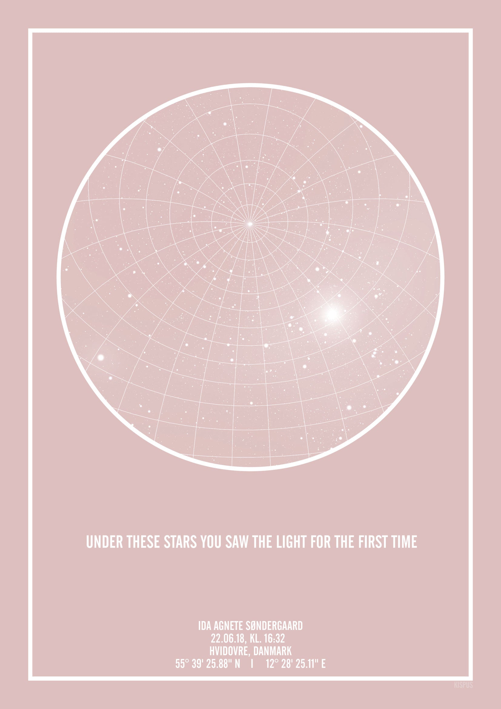Produkt ID. Personlig-stjernehimmel-plakat-lyserd-hvid-tekst-lyserød-himmel-kvatorgitter