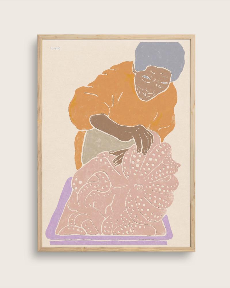 Kazuko er et japansk pigenavn som også betyder familie. Navnet består af to tegn der betyder henholdsvis harmoni og barn Motivet forestiller en ældre kvinde. Som omhyggeligt renser en blæksprutte.