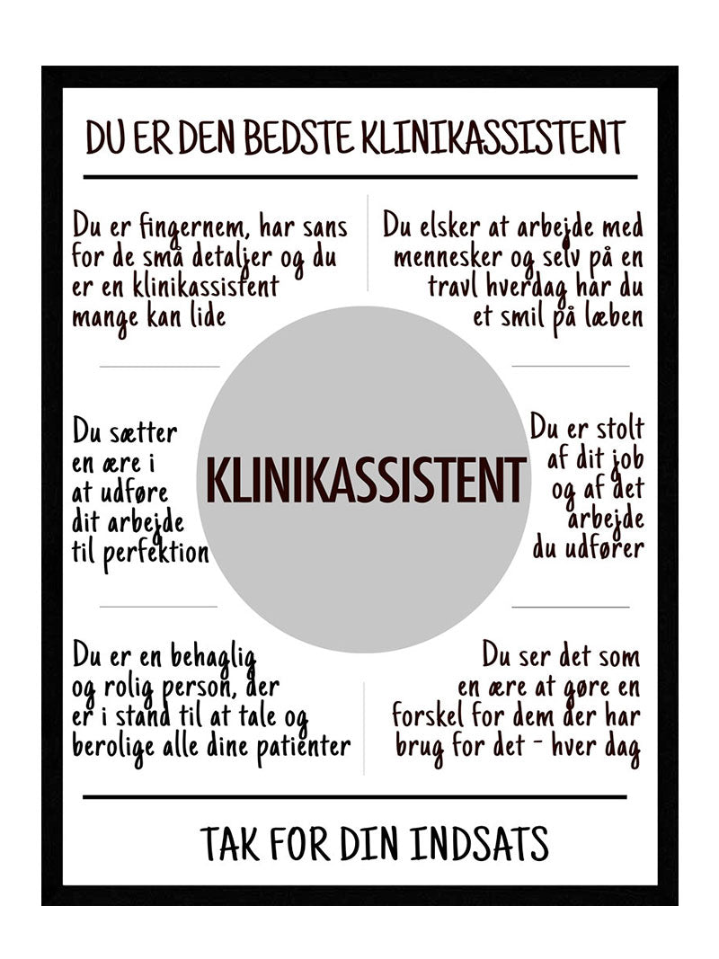 Klinikassistent plakat Kender du en klinikassistent der gør en forskel og fortjener, at få lidt anerkendelse, Så har vi den perfekte id, at give... Nemlig vores klinikassistent plakat Så kender du en nyuddannet klinikassistent eller også blot en klinik