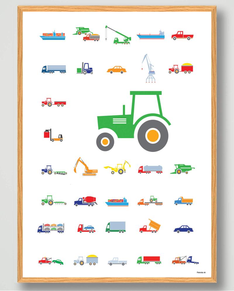 Køretøjer Denne plakat til børneværelset har det hele, at byde på Hvis dit barn er bidt af maskiner. Traktorer. Kraner. Mejetærskere og meget mere. Ved første øjekast springer den grønne traktor i øjnene. Det farverige. Positive design og det tydelige mo
