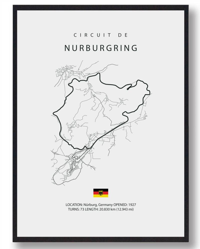 Formel 1 Nrburgring mørk plakat Kort introduktion. En markant plakat med motiv fra Nrburgring i mørkt design til dig der ønsker racerløb med kant og visuel tyngde. Motiv og stemning Motivet gengiver banelayoutet mod en mørk baggrund. Hvor linjern