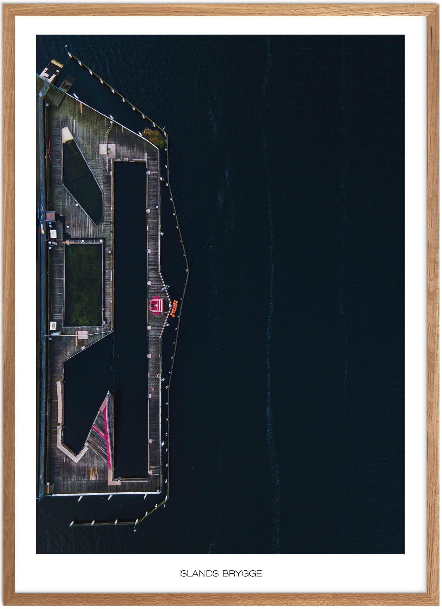 I København-bydelen Islands Brygge. Også kendt som Bryggen. Finder du dette smukke havnebad. De i alt tre bassiner har plads til 600 badende gæster. Og på en varm sommerdag kan du være sikker på At badet er fuld af liv. Plakat af Islands Brygge en af man