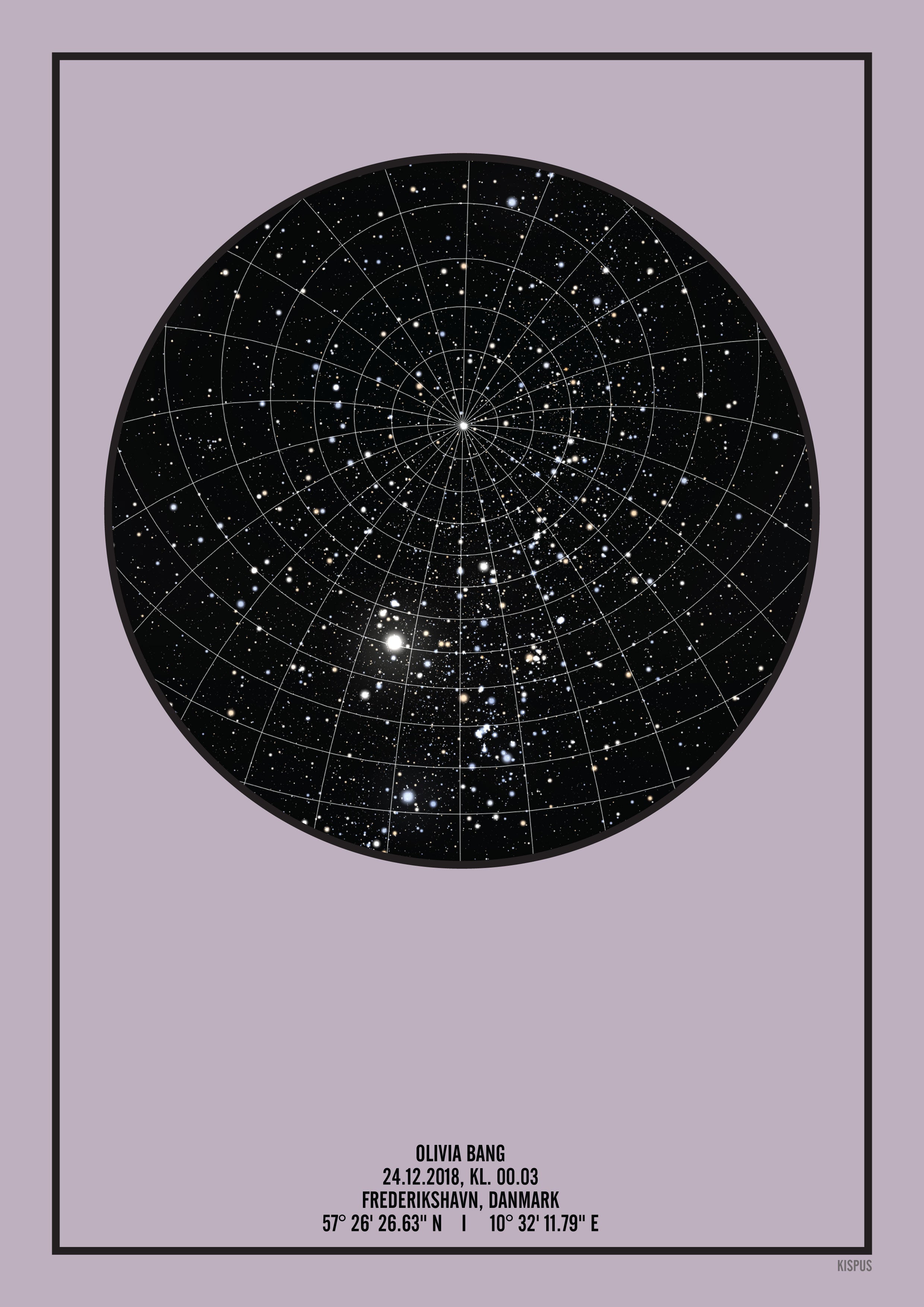 Produkt ID. Personlig-stjernehimmel-plakat-lyselilla-sort-tekst-sort-himmel-kvatorgitter