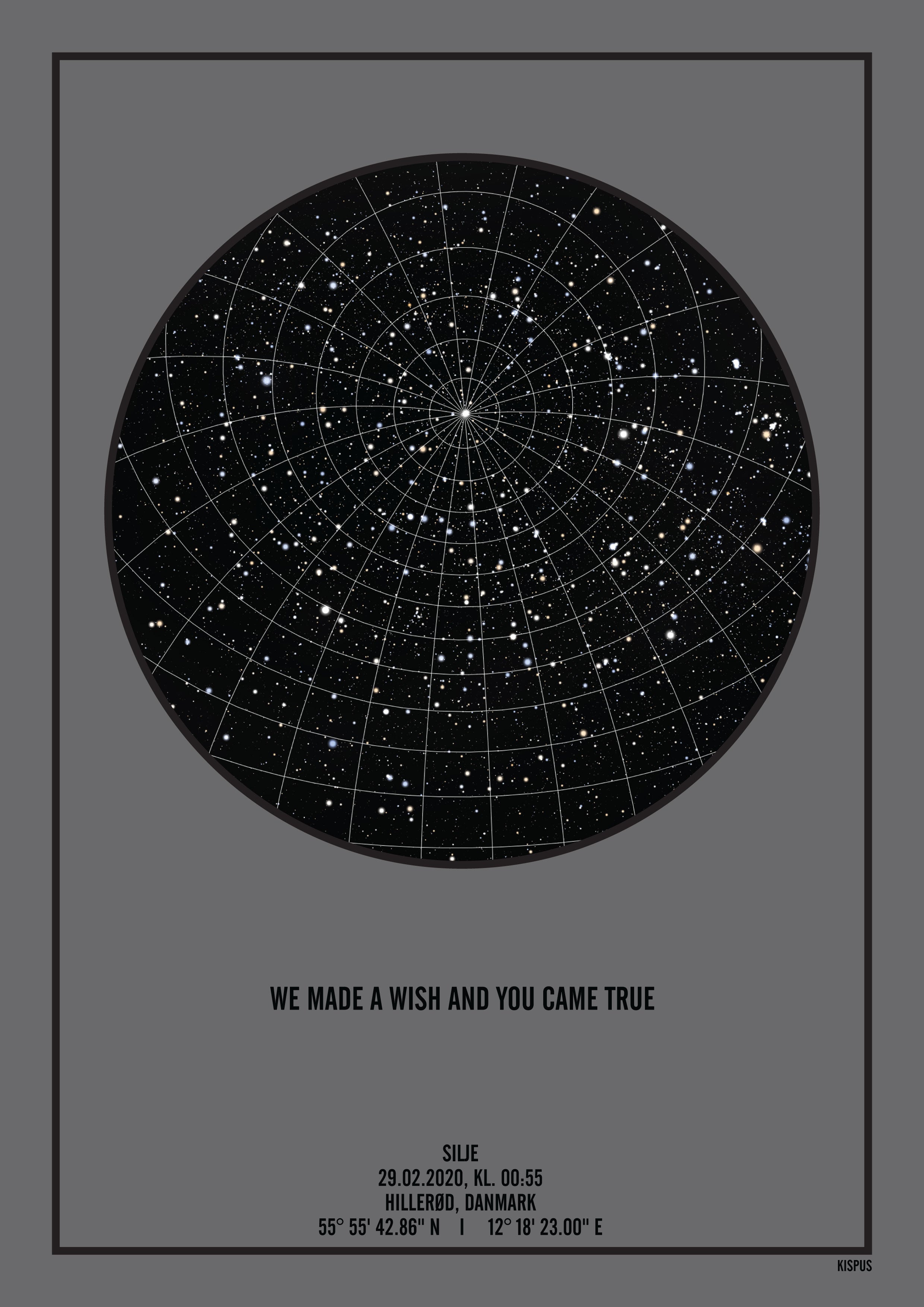 Produkt ID. Personlig-stjernehimmel-plakat-mrkegr-sort-tekst-sort-himmel-kvatorgitter