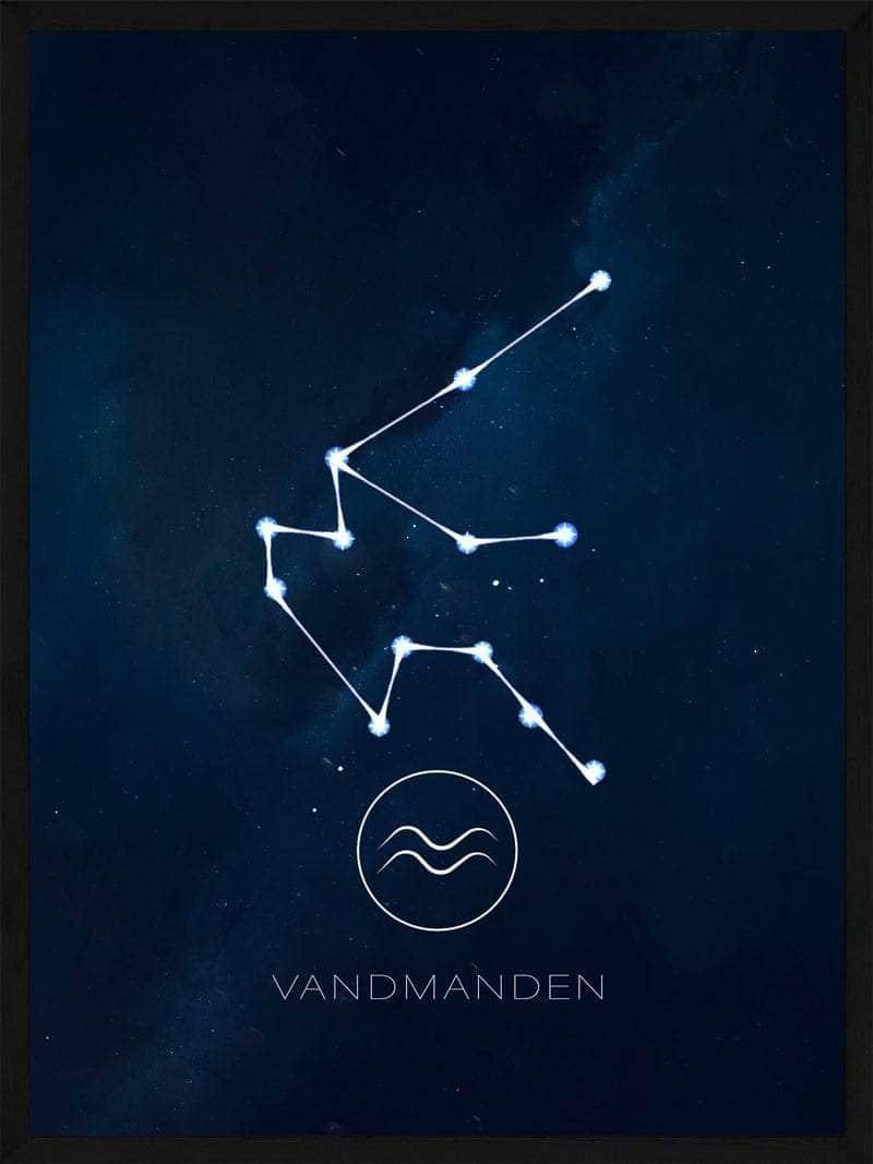 Vandmanden stjernetegn plakat På denne Vandmanden stjernetegnplakat ser vi stjerne billedet Vandmanden. Som er markeret tydlig hen over en fantastisk natte himmel. Farverne i baggrund er holdt i sort og mørke farver. For, at selv Vandmanden stjernete